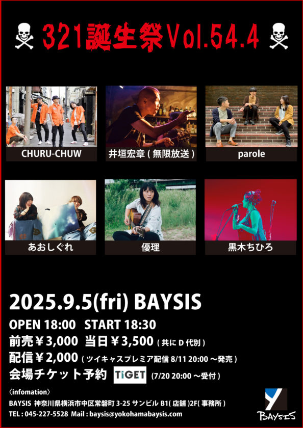 9/5(金) 横浜・関内ベイシス 2025.9.5 BAYSIS PRESENTS 出演 : CHURU-CHUW / 井垣宏章(無限放送) / parole / あおしぐれ / 優理 / 黒木ちひろ 会場: 横浜 関内 BAYSIS OPEN 18:00 / START 18:30 前売¥3,000 / 当日¥3,500 (別途Drink代¥600)配信 ¥ 2,000 (9/12まで視聴可) ※ライブ当日BAYSISオンラインストアにてグッズ販売・ドリンク差し入れを受付けます https://baysis.stores.jp/